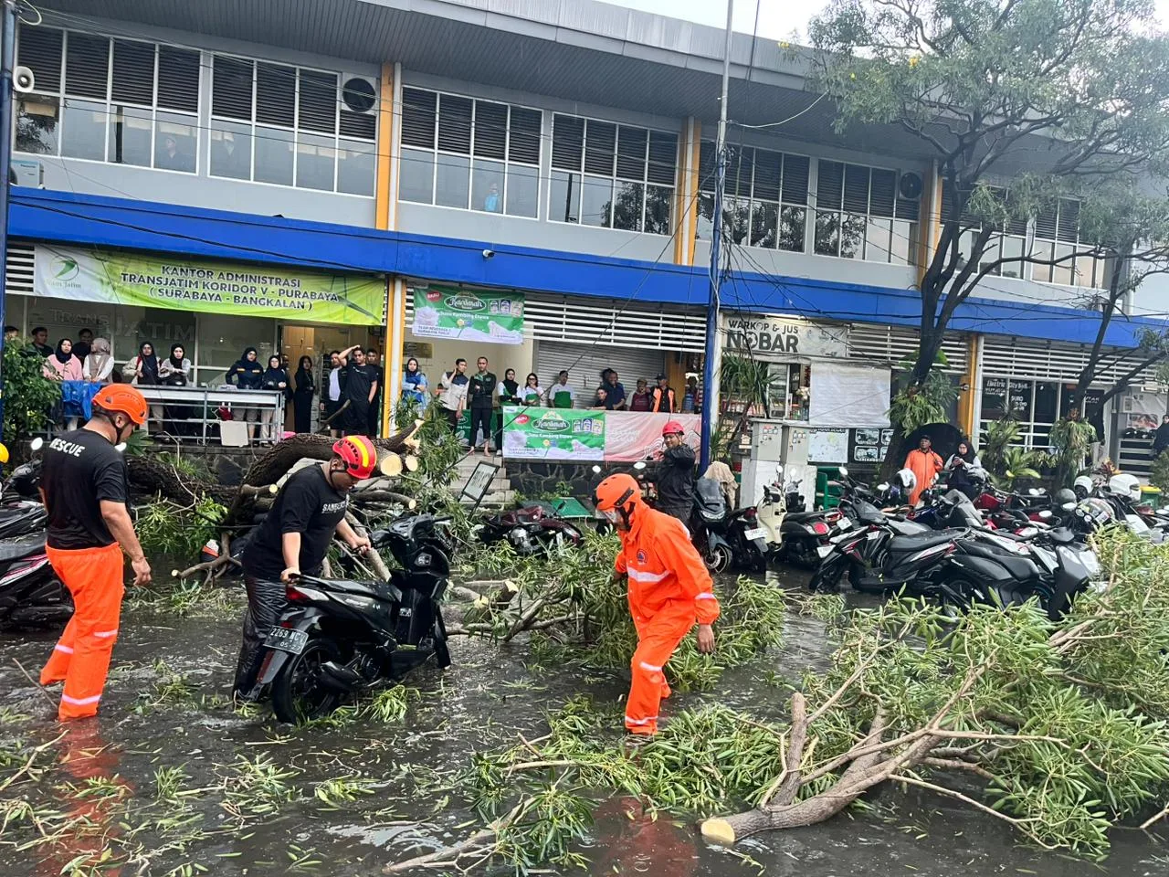 Kronologi dan pantauan perkembangan peristiwa dari lokasi sekitar pukul 18.00 WIB, bahwa pda hari Senin, 16 Maret 2026 pkl. 15.00 WIB terjadi hujan intensitas sedang hingga lebat disertai angin kencang mengakibatkan terjadi pohon tumbang menimpa beberapa kendaraan yang terparkir di Terminal Bungurasih.